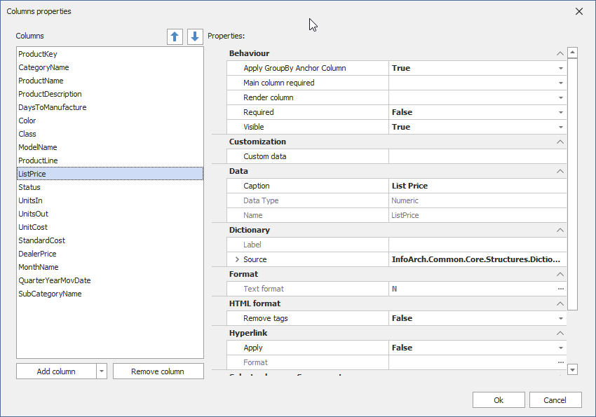 From the example below, the report definition columns are arranged in the following order. Notice how the new column 'List Price' is positioned after the 'Product Line' column.